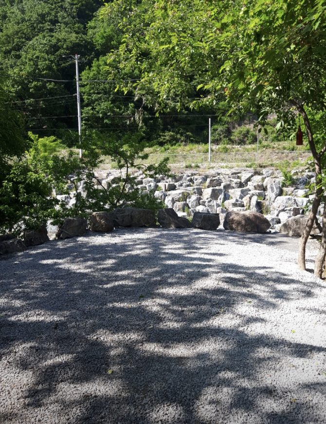 저희는 30번, 31번 사이트를 예약했는데, 31번 사이트 뒤쪽에는 작은 개울이 흐르고 있었어요! 이게 정말 대박이었는데요, 마치 우리만 쓸 수 있는 천연 냉장고 같았어요. 강아지 발도 씻기고, 음료수나 술도 넣어두니 세상 시원하더라구요. 직접 수온을 재보니 12도 정도! 냉장고가 따로 필요 없었습니다.