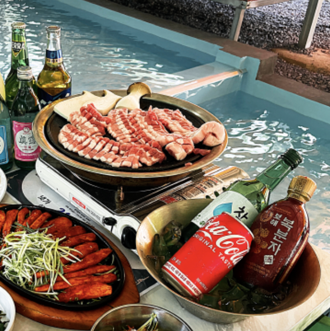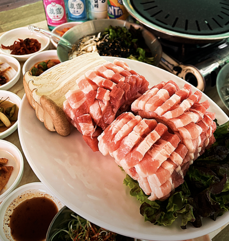 삼겹살 & 왕새우: 물놀이 후 먹으니 꿀맛!
