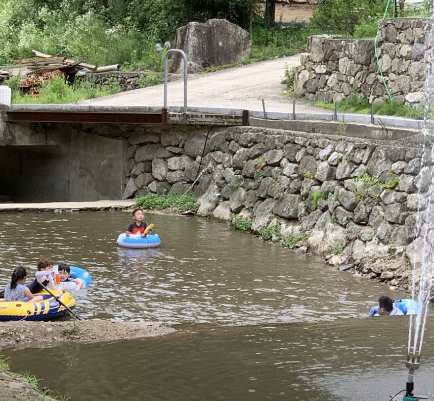지난주 내내 비가 많이 내려서 계곡 물이 불어있을까 봐 걱정했는데, 다행히 물살은 셌지만 높이가 깊지 않아서 물놀이하기에 위험하지 않았습니다. 물이 가장 깊은 곳은 성인 170cm 기준 가슴~어깨 높이 정도였고, 대부분은 종아리~무릎 높이여서 아이들도 안전하게 놀 수 있을 것 같았어요.