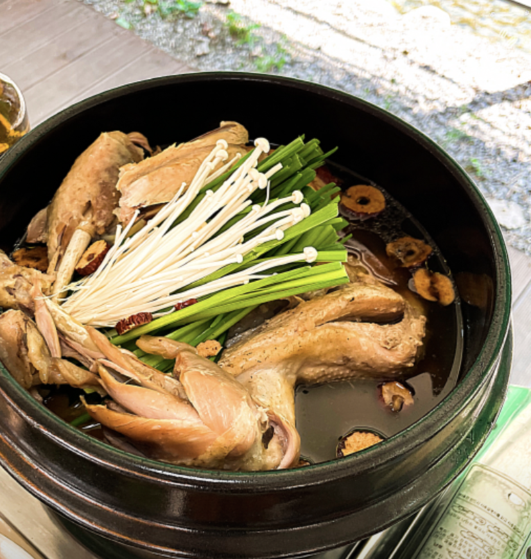 가장 먼저 등장한 메뉴는 항아리 토종닭백숙이었어요! 항아리에 담겨 나와서 그런지 더욱 먹음직스러워 보였습니다. 닭 크기는 그리 크지 않았지만, 닭 안에 찹쌀죽이 듬뿍 들어있어서 든든하게 먹을 수 있었어요. 푹 익은 닭고기는 정말 부드러웠고, 국물은 진하고 깊은 맛이 일품이었습니다!