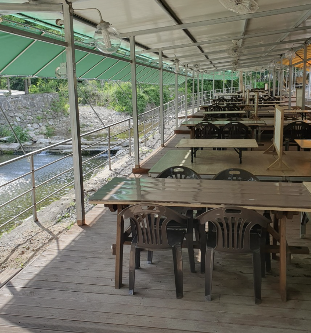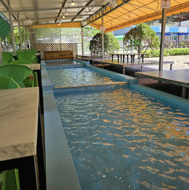 저는 주말에 방문할 예정이었기 때문에 미리 전화로 예약을 했습니다. 특히 계곡 바로 옆자리는 인기가 많으니, 꼭 미리 예약하시는 게 좋아요! 예약 시 원하는 자리를 말씀하시면 최대한 반영해 주시는 것 같았습니다. 저는 냇가 21번 자리에 앉았는데, 바로 옆에 미니 풀장이 있어서 아이들이 노는 모습을 보면서 식사를 즐길 수 있었어요. 물론, 물총 세례는 감수해야 합니다...^^